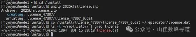 cd /installunzip 2025kfslicense.zipcp /install/license_47307/license_47307_0.dat ~/replicator/license.datls -l ~/replicator/ | grep license