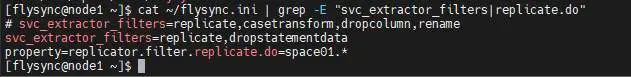 #配置DML过滤策略(作为源端时)--1、只抽取space01模式下的增量数据,静默安装时已配置,确认配置。cat ~/flysync.ini | grep -E "svc_extractor_filters|replicate.do"