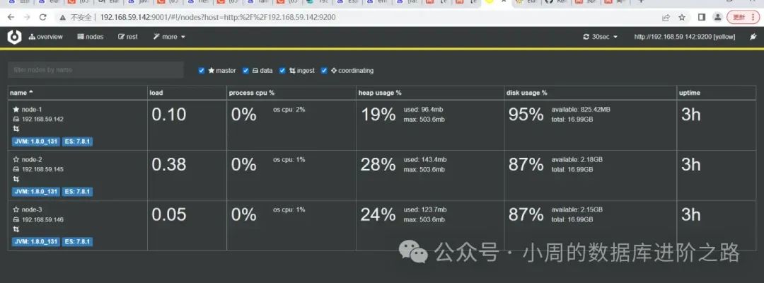 预期输出类似:curl http://localhost:9200/_cat/nodes?vip heap.percent ram.percent cpu load_1m load_5m load_15m node.role master name