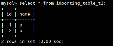 use martincreate table importing_table_t1(id INT PRIMARY KEY AUTO_INCREMENT,name varchar(10)) engine = innodb;insert into importing_table_t1(name) values ('a'),('b');