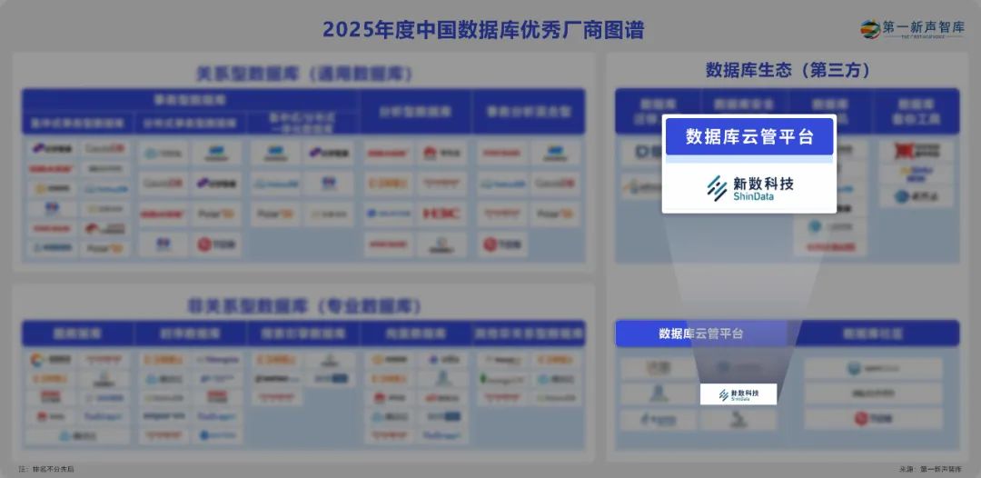 近日,第一新声正式发布《2025年度中国数据库优秀厂商图谱》。新数科技凭借在数据库云平台领域领先的产品实力与实践案例,成功跻身 “数据库云管平台” 优秀厂商行列,再次彰显其在行业内的技术优势与领航地位。