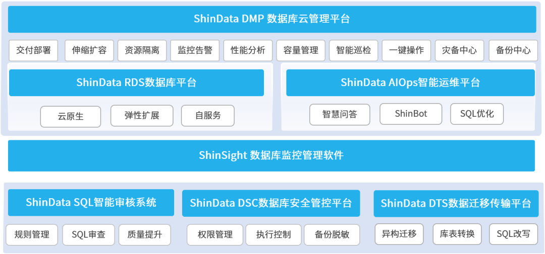ShinData新数科技是业内数据库云平台软件创新引领企业,产品领域涵盖数据库dbPaaS云管理平台、数据库安全管控平台、数据库SQL智能审核平台、AIOps智能运维平台、数据库容器云平台和数据迁移传输平台等。广泛应用于金融、制造、能源、零售和通信等行业,为广大企业在新时期云计算、大数据、人工智能等环境下的数据库基础软件转型变革提供持久源动力。