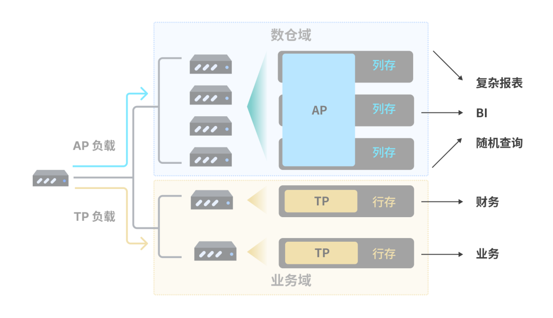 而在实际的项目中,针对 TP 型业务,我们可以为每条业务线单独分配一个域,这样不仅能做到 AP、TP 的负载隔离,还能做到业务间的负载隔离。