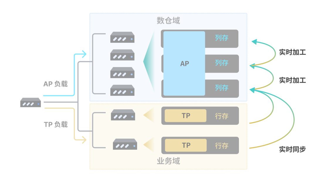一份数据同时存储为行存和列存,执行时优化器判断是 TP 算子,就走左侧行存,AP 型算子,则走列存。