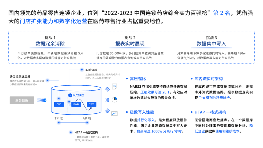 YMatrix 和友商一起,为某全国排名前 2 的医药连锁零售上市企业提供了具备细粒度的业财一体实时分析能力的产品。YMatrix 在该项目中充分展现了产品的 HTAP 能力 和实时分析能力: