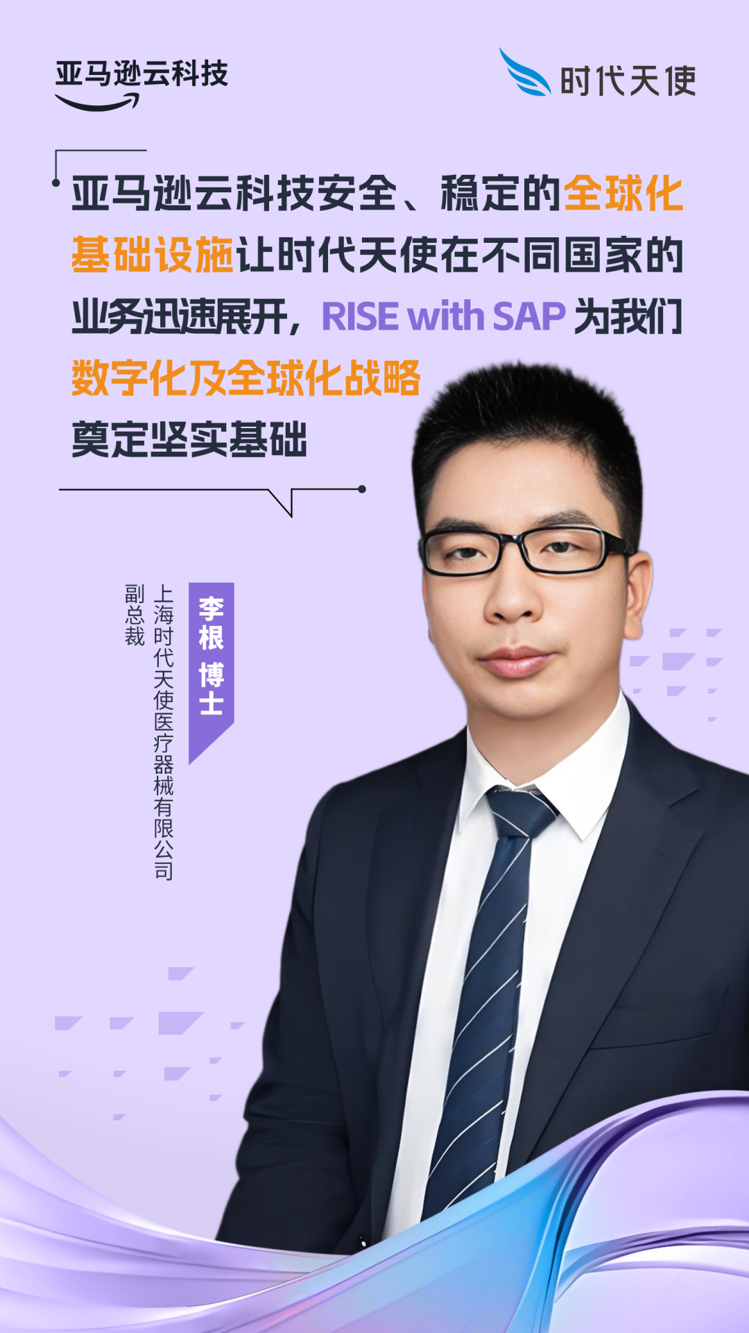 作为亚马逊云科技和SAP共同服务的客户,上海时代天使医疗器械有限公司副总裁李根博士在思爱普中国峰会上做了精彩演讲,分享了时代天使基于RISE with SAP的一站式数字化解决方案,整合HR、供应链、销售、财务等核心业务流程,实现智能化运营。同时,借助亚马逊云科技提供的全球基础设施和合规框架,时代天使为系统铺就了一条“云高速公路”,加速全球业务发展;亚马逊云科技强大的技术能力和云上的先进服务,还加速了时代天使在数字化创新和业务流程上的持续变革。