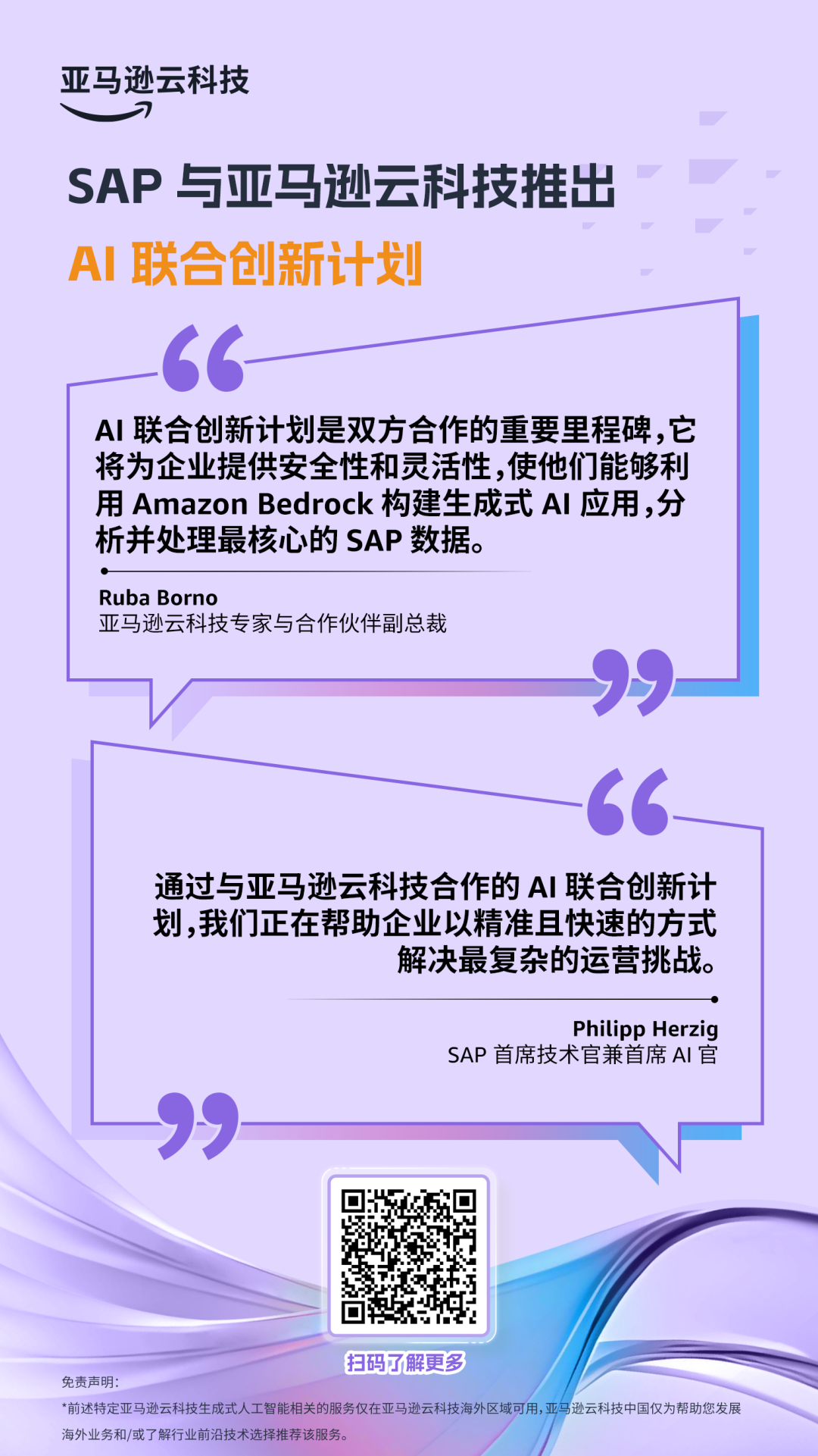 在前不久的SAP蓝宝石大会上,SAP与亚马逊云科技宣布启动全新的AI联合创新计划,帮助合作伙伴构建生成式AI应用和智能体,助力客户快速解决实时业务挑战。该计划整合了SAP的企业级技术与亚马逊云科技的生成式AI服务,汇聚了双方的专业人员,为客户提供全方位的实施支持。还将提供专门的技术资源、云服务资源等支持,用于开发、测试和部署行业特定应用。