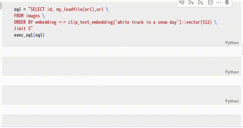 ORDER BY embedding <-> clip_text_embedding('white truck in a snow day')::vector(512) \