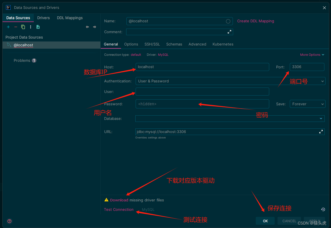 在弹出的窗口中,输入你的数据库URL、用户名和密码。例如: