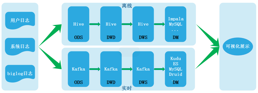 随着实时计算引擎的不断发展以及业务对于实时报表的产出需求不断膨胀,业界最近几年就一直聚焦并探索于实时数仓建设。根据数仓架构演变过程,在Lambda架构中含有离线处理与实时处理两条链路,其架构图如下:
