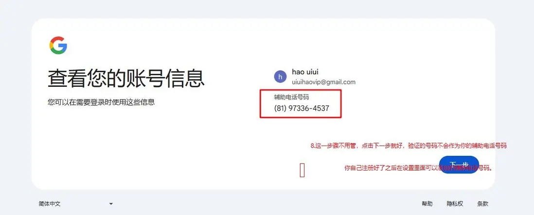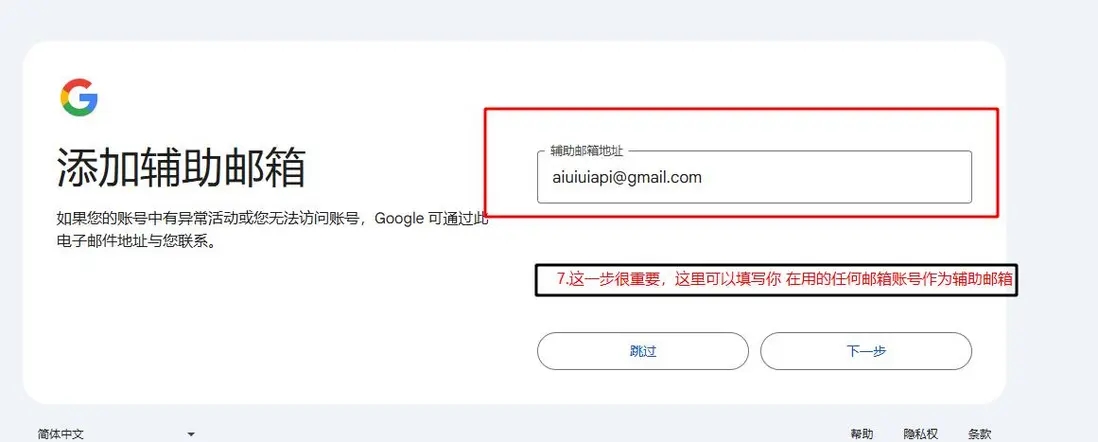 在“添加辅助电话号码”这一步,直接点击“跳过”。此处的手机号与之前的验证手机号不同,可稍后在账号设置中添加。