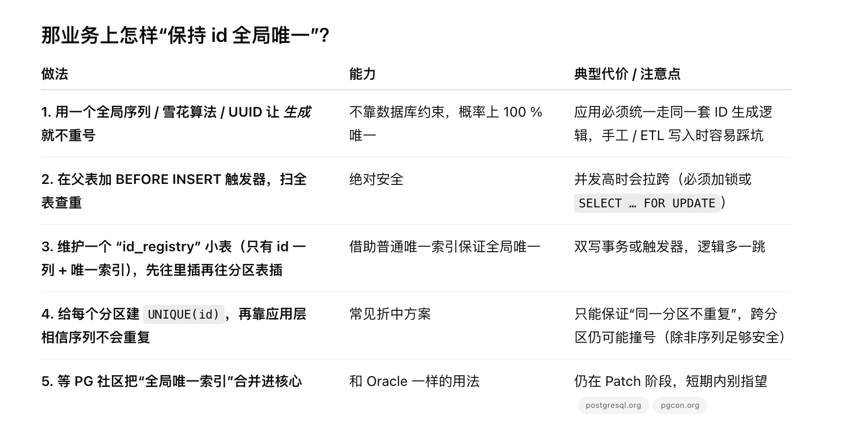 好久没发文,是最近我实在不知道写点啥。随着国产化进程,很多 oracle 都在进行迁移,最近遇到了一个分区表迁移之后唯一性的问题。oracle 数据库中创建主键或者唯一索引,不需要引用分区键,但是 PG 就不行,PG 创建主键或者唯一键需要带上分区键,这样一来其唯一性就受到了破坏。