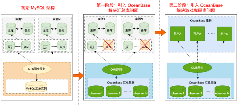 在第二阶段,计划使用 OceanBase 解决游戏库隔离问题。我们充分利用 OceanBase 的租户隔离功能,以满足业务间尤其是多游戏间的隔离需求。为此,直接在上游将多实例迁移至 OceanBase,通过多租户模式实现资源隔离。对于汇总查询,也是由 OceanBase 来完成。