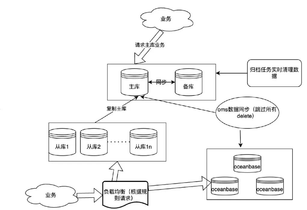 引入 OceanBase 后,我们的业务架构如图 9 所示,业务痛点得到有效解决。目前,OMS 工具会将 MySQL 主库所有数据同步到 OceanBase 集群中,上游 MySQL 主库会依据业务逻辑定期清理大量数据,以降低 MySQL 的存储空间,而 OMS 的链路设置了忽略 MySQL 中清理数据的 DML、DDL 操作,保证 OceanBase 集群中有一份完整数据,供业务查询。