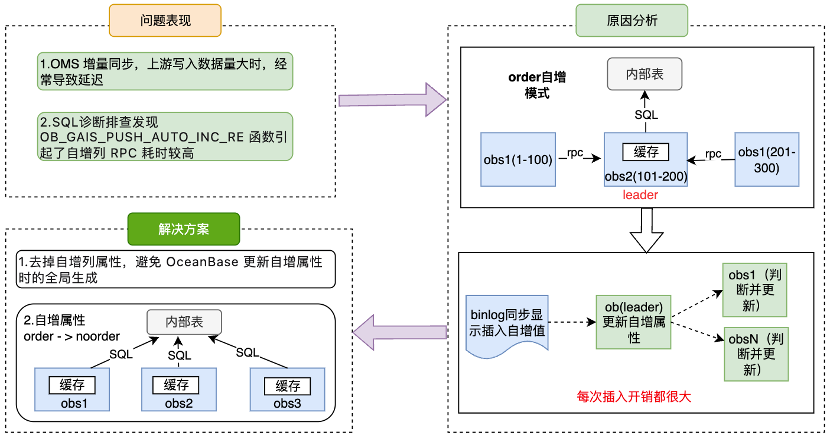 比如,当 leader 分发任务给 OBServer 1 去更新其自增属性时,同时 OBServer N 也可能需要更新自己的自增属性,它们都会向 leader 发起请求,从而导致大量的 RPC 通信。这种 RPC 开销会大幅降低插入操作的效率,进而影响整个系统的性能。
