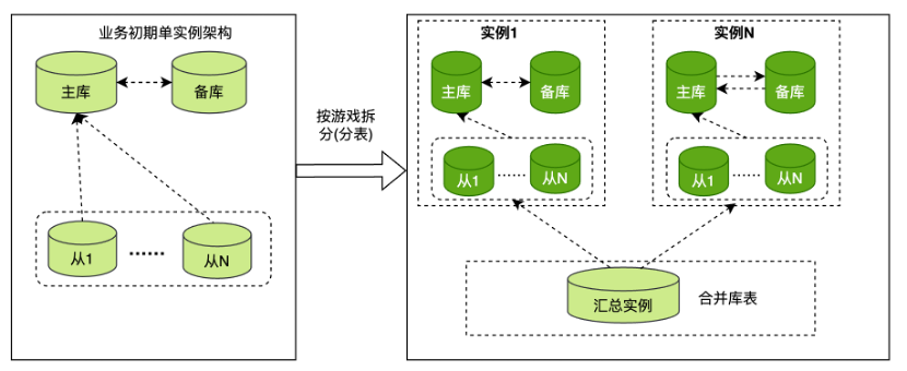 基于底层的 DB SaaS 服务,以一个游戏周边的服务为例,业务初期我们采用单实例主备从的架构模式。随着接入的游戏数量不断增加,这种架构已无法满足日益增长的请求需求。因此,我们决定对数据库进行拆分,比如将一个实例拆分成多个实例,以应对这一挑战,如图 2 所示。