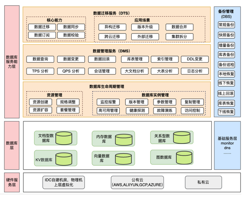 第二层是数据库层。在硬件服务层之上,我们构建了强大的数据库服务层。这一层提供了多种类型的数据库服务,包括文档型、内存型、关系型、KV 型、向量型以及图数据库,全面满足不同的数据存储与处理需求。