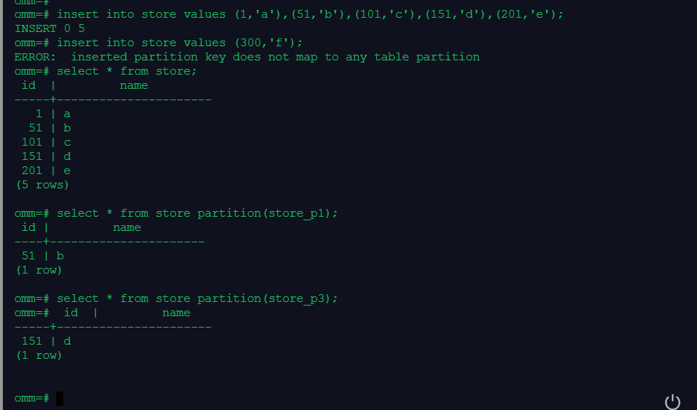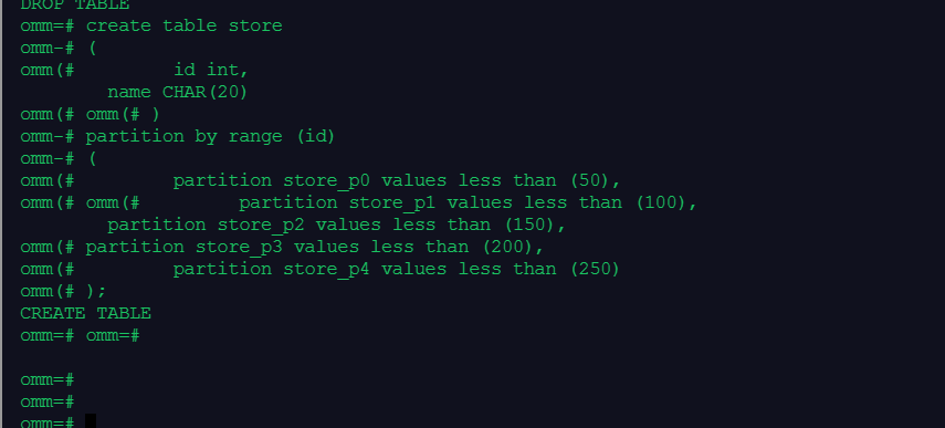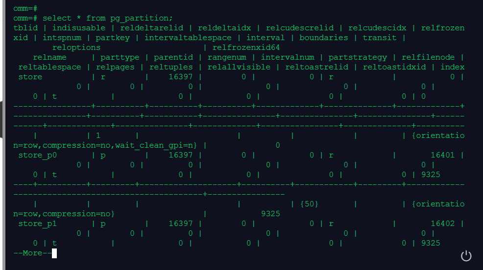 drop table update_table;今天第 8 课,学习 openGauss 分区表! 分区表是把逻辑上的一张表根据某种方案分成几张物理块进行存储,这张逻辑上的表称之为分区表,物理块称之为分区。 分区表是一张逻辑表,不存储数据,数据实际是存储在分区上的。 课后作业打卡 1.创建一个含有5个分区的范围分区表store,在每个分区中插入记录 create table store ( id int, name CHAR(20) ) partition by range (id) ( partition store_p0 values less than (50), partition store_p1 values less than (100), partition store_p2 values less than (150), partition store_p3 values less than (200), partition store_p4 values less than (250) );2.查看分区1上的数据 insert into store values (1,'a'),(51,'b'),(101,'c'),(151,'d'),(201,'e'); insert into store values (300,'f'); select * from store; select * from store partition(store_p1); select * from store partition(store_p3);3.重命名分区2 alter table store rename partition store_p2 to store_lucifer2;4.删除分区5 alter table store drop partition store_p4;5.增加分区6 alter table store add partition store_p5;6.在系统表pg_partition中查看分区信息 select * from pg_partition;7.删除分区表 drop table store;