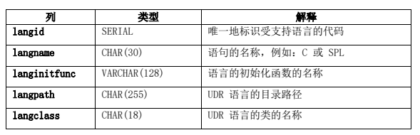 sysroutinelangs 系统目录表列出了用户定义的例程 (UDR) 的受支持编程语言。它具有