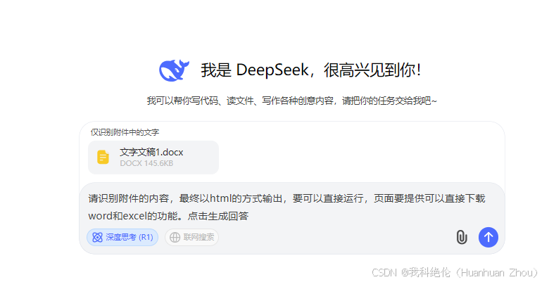 请识别附件的内容,最终以html的方式输出,输出的内容要精准进行分列,可以直接运行,页面要提供可以直接下载word和excel的功能,点击生成回答。