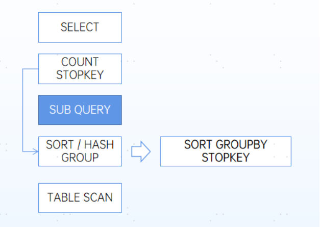 对比两边的计划示意图,可以很明显的看到,左边的COUNT STOPKEY + SORT HASH GROUP 被优化成了SORT GROUPBY STOPKEY,这个优化很直观的从2个算子合并成了1个算子,在子查询数据量大而STOP KEY少的场景下,合并后的算子收益非常明显。