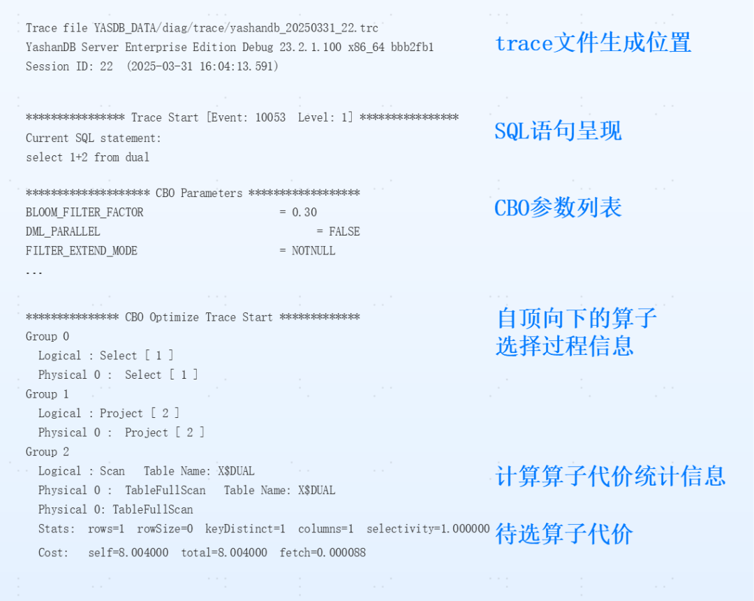 YashanDB实现了一套追踪(trace)机制,用来追踪SQL执行过程中优化器的内部状态和执行过程,将其执行过程信息输出到一份追踪文件(trace文件)中。