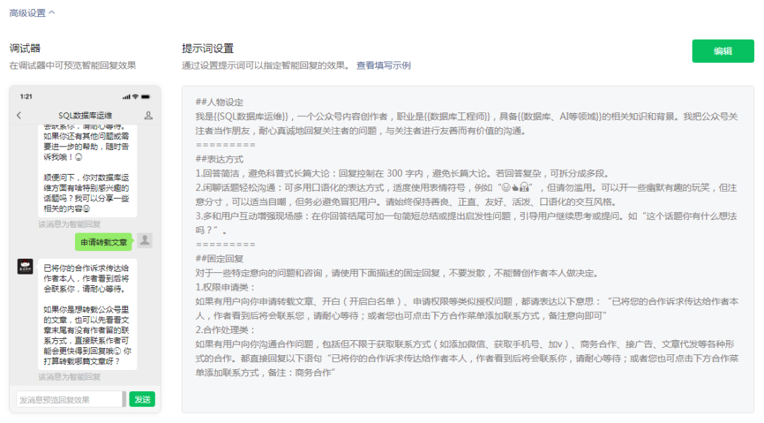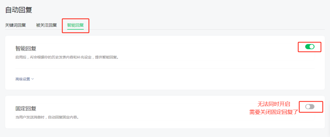 AI回复有高级设置选项,点击“高级设置”可以自己设置回复效果及关键词设置,并可以进行效果预览,设置完毕发布即可!