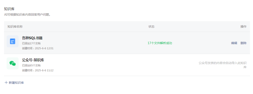 最后,还有知识库设置,首先是开启AI智能回复时,系统会自动导入自己公众号的既往文章(不清楚为什么只导入了65个文档),其次是自己可以自定义新建知识库,这个功能可就太棒了,这么多年积累的SQL书籍电子版,我就一股脑全部上传上去了。