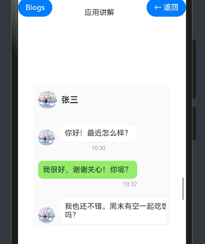 { id: 2, content: '我很好,谢谢关心!你呢?', time: '10:32', isMe: true },