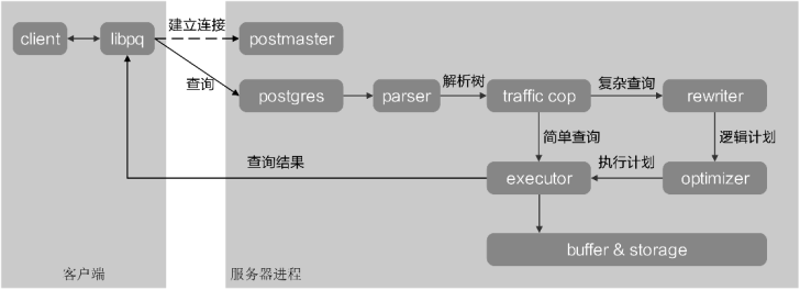 建立连接后,客户端进程可以将查询发送到后端服务器。查询使用纯文本传输,即在前端(客户端)中没有进行解析。服务器解析查询语句、创建执行计划、执行并通过在已建立连接上传输检索到的结果集,将其返回给客户端。