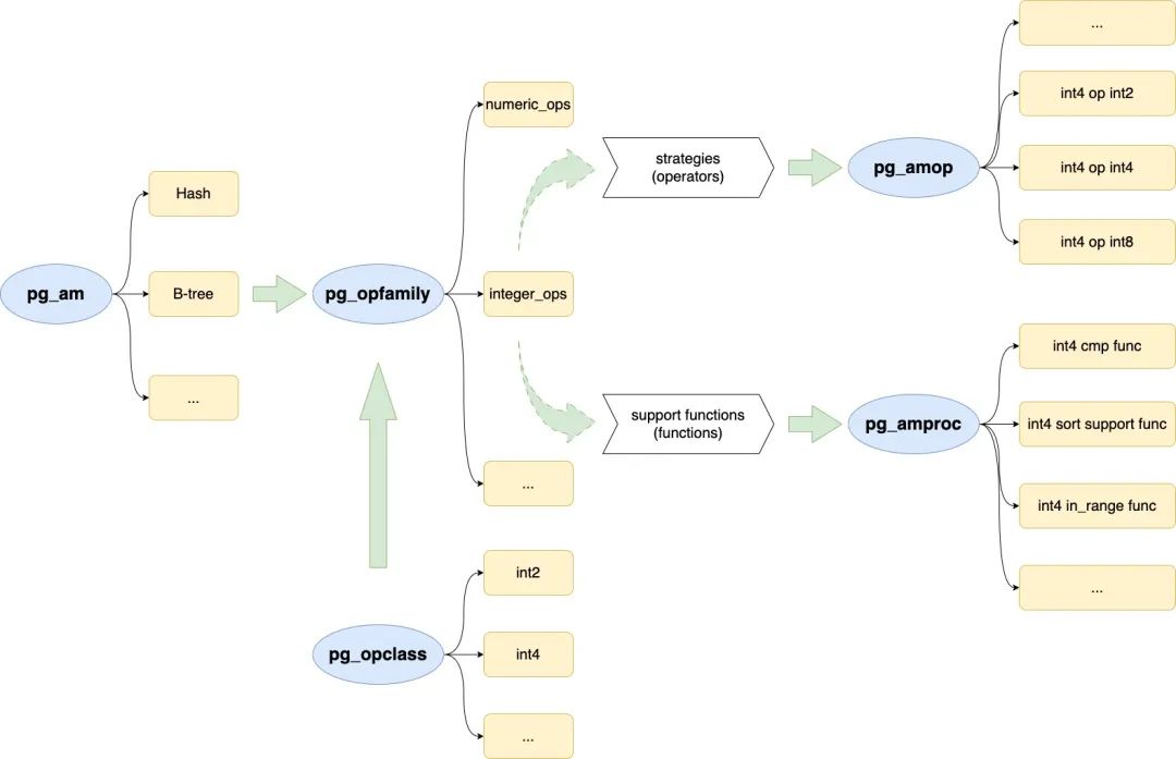 pg_am / pg_opfamily / pg_opclass / pg_amop / pg_amproc 之间的关系