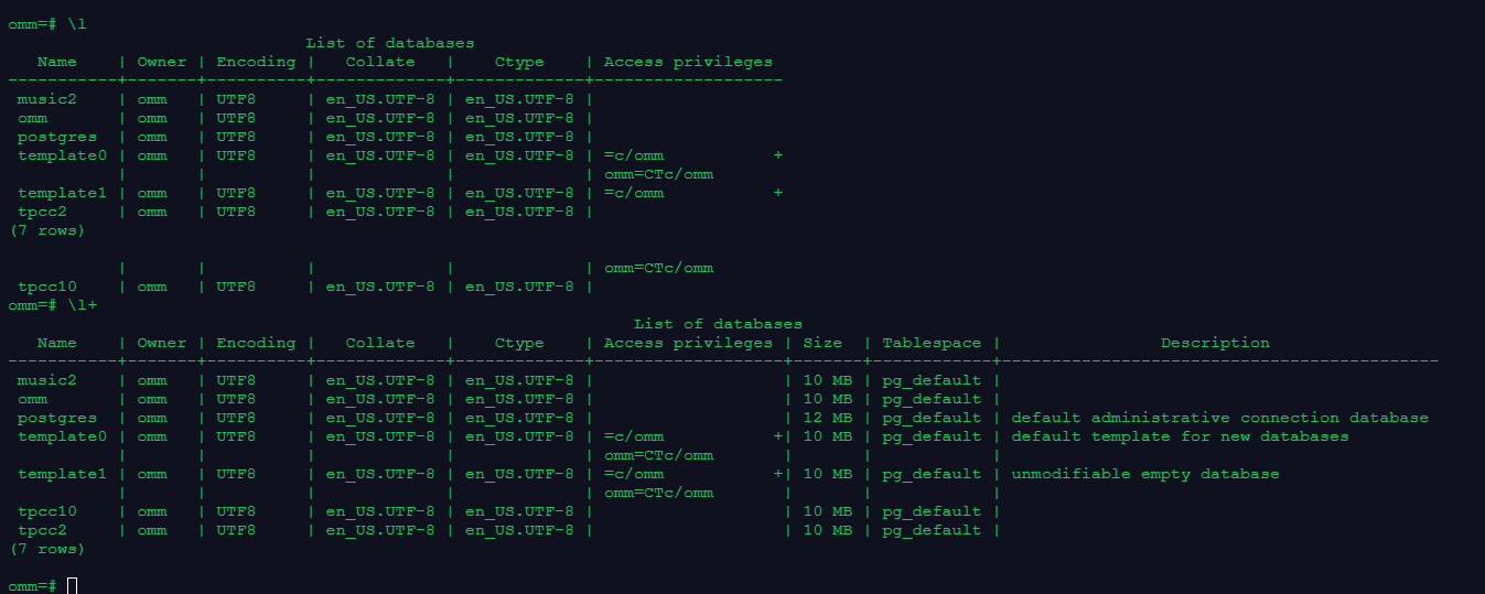 3.分别使用\l和\l+两个元命令查看数据库信息