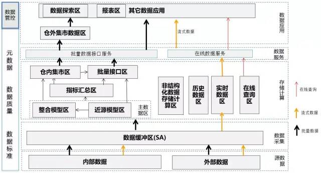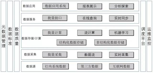 数据中台这个概念是由阿里首次提出,阿里现在拥有众多业务分支系统,如淘宝,天猫,阿里妈妈,阿里巴巴等,每套系统都有自己的体系和数据源,都在各自的系统上做了很多服务,但数据在各系统之间无法共享,各系统之间还会有功能和数据,服务和应用的冲突,为了解决这些问题,阿里开始整合挖掘数据,打造数据中台,从一开始知识做数据的监测和统计到后来的数据化运营和分析,再到搜索个性化,定制化营销,再到智能化,渐渐让各个体系融合在一起,建立统一的体系,就算再扩展业务也是纳入这个中台,用相同的技术和模式进行运营。所以数据中台是指通过数据技术,对海量数据进行采集、计算、存储、加工,同时统一标准和口径。数据中台把数据统一之后,会形成标准数据,再进行存储,形成大数据资产层(数据模型,算法服务,数据产品,数据管理),进而为客户提供高效服务。这些服务跟企业的业务有强关联性,是这个企业独有的且能复用的,是企业业务和数据的沉淀。比如企业自建的2000个基础模型,5万个标签。数据中台还包括了数据技术,比如采用统一的技术及框架对海量数据进行采集、计算、存储、加工的一系列技术集合。数据中台不仅能降低重复建设,减少烟囱式协作的成本,也能快速提供业务数据进行分析,使数据产生价值,同时数据中台通过为业务场景提供数据服务,业务场景也不断产生新的数据及分析模型反馈,滋养给数据中台,使数据中台不断发展。那从银行来说,银行数据仓库体系应该包括数据中台的功能,许多银行特别是国有银行和股份制银行借鉴国外先进银行的经验和架构,在2000年后都开始建立数据仓库,进行了各业务数据的整合并统一提供数据服务,有些金融集团也在集团层面上整合了各子公司的数据。在数据规范和整合方面许多银行已经完成,数据平台技术架构也已经统一,但是在数据意识、数据思维方面和互联网企业还是有不少差距,许多银行业务拓展更多依赖经验、客户经理、简单的数据统计,大多应用往往集中在报表、监管报送、审计、风险控制等管理应用,在客户行为分析、精准营销、风险控制等方面还未深挖,在机器学习、AI方面的新技术使用也较迟缓。互联网公司在发展初期着重于产品功能及用户拓展,需要依靠数据来了解客户,分析客户,虽然一开始没有数据中台,各产品各自获取产品、客户相关数据并进行分析挖掘。通过数据发现用户在使用产品中的阻碍和问题,找出客户的痛点。那随着多个产品的成熟以及发展,数据量快速增加,数据分析工作越来越复杂,数据分析知识经验也需要沉淀,所以数据中台也为了各产品能更好的共享经验、共用数据而应用而生。二、银行数据仓库体系架构
