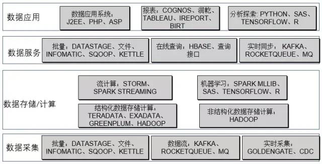 UML对系统架构的定义是:系统的组织结构,包括系统分解的组成部分,它们的关联性,交互,机制和指导原则,例如对系统群就是定义各子系统的功能和职责,如贷款系统群可能分为进件申请、核额、交易账务、贷后管理、管理台等子系统,对于系统就是定义各模块的功能和层次,例如管理台包括权限管理、用户管理、交易管理、逾期管理、统计分析等功能。技术架构是指从技术实现层面描述系统,主要是根据系统架构组成部分确定每层使用什么技术框架,例如中间件、WebService等。那对于数据仓库系统群具体可以分为哪些部分以及他们的具体实现技术如何呢?以下是银行数据仓库的系统功能图:1、数据源:主要是指行内交易系统、外部采购或合作的第三方数据等3类、包括结构化数据以及非结构化的数据,结构化数据主要是存储在各个行内系统数据库中的表数据,非结构化数据包括图片、语音、文档等类型的数据。2、数据采集:即如何将数据从数据源获取到数据仓库中,就是我们常说的ETL随着数据仓库功能的发展这部分不仅仅包括批量数据获取还包括实时数据流以及数据库数据实时采集:主要包括从数据源获取大批量的数据,这是银行数据仓库主要的数据采集方式,批量采集的采集数据频率较低,一般是每日凌晨获取上一天的数据,有些场景也可以每小时采集一次,由于采集的数据量一般较大,对数据源也有IO的影响,因此不建议采集频率太高。批量采集需要支持从关系型数据库、内存数据库、文件中批量获取并加载到数据仓库中。在技术实现中,批量采集工具需要能支持多种数据源的采集和加载,批量采集可选择的工具较多,可以采用商业化软件如IBM的DATASTAGE以及INFORMATICA公司的INFORMATICA,也可以采用开源的SQOOP和KETTLE。也可以采用各关系型数据库以及HADOOP自带的文件导出和导入功能。指实时同步源系统的数据库数据到数据仓库,这样可以在数据仓库中实时分析数据。实时采集通过专门的工具监控源系统数据库日志进行数据同步,数据源系统无需改造,这种采集方式针对数据统计时效性非常高的场景。在技术实现中,实时采集工具需要支持从多种类型数据源到多种类型目标数据库的实时同步,这块商业化软件比较成熟,如ORACLE的GOLDENGATE、IBM的InfoSphere Change Data Capture等软件。开源软件中kettle也支持数据库实时同步,但需要在源表增加时间戳字段。即通过Queue的方式从数据源系统获得数据流消息,数据仓库实时获取Queue中的消息进行实时数据流计算。这种数据采集方式也是面向统计时效非常高的场景,需要数据源系统增加实时发送消息的功能。在技术实现中,由于数据流计算在互联网公司使用广泛,涌现出许多优秀的开源软件,如开源的KAFKA、ROCKETQUEUE等QUEUE工具,可以支持实时监控文件、数据库的变化并将变化数据发送到QUEUE中的开源软件FLUME。对于MYSQL也可以通过BINLOG和SHYIKO监控MYSQL日志,将数据变化发送到QUEUE中,那在商业化软件中IBM的MQ是各银行经常使用的中间件。3、数据存储/计算:数据存储计算是数据仓库的主要功能。数据存储主要指结构化数据和非结构化数据的按格式存储,计算指基于存储的数据进行关联、汇总、数值计算等批量处理、实时流计算和复杂的机器学习。实时流计算主要指对大规模流动数据在不断变化的过程中实时地进行分析,比如实时展示目前银行所有转账的笔数和汇总金额。需要将每笔转账进行不断计算。目前在银行中应用场景还较少,但随着互联网渠道的发展后续也将出现更多的应用场景。机器学习是专门研究计算机怎样模拟或实现人类的学习行为,以获取新的知识或技能,重新组织已有的知识结构使之不断改善,简单来说就是通过数据来发现规律,累积经验,并对新的数据进行分类或预测。比如通过学习近1年的上证指数及交易量的变化来预测明天的上证指数。目前炒的人工智能、深度学习也是属于机器学习范围。目前银行在风控、反欺诈、精准营销等方面也逐步在使用多种机器学习算法来提高成功率。由于数据仓库是银行的数据枢纽,银行的所有业务数据都会在数据仓库保留,因此数据量较大,一般小银行数据量在TB级,股份制银行大概在PB级,国有大银行在ZB级。因此存储和计算的的可扩展性、性能都很重要。那在目前银行中数据仓库的存储和计算一般采用MPP数据库(大规模并行数据库)和HADOOP相结合的技术方案。1)MPP数据库:主要是面向结构化数据存储、批量计算和机器学习。在HADOOP出现前,商用的MPP数据库是数据仓库的主流技术平台,它使用简单,同时具有超大规模计算能力和良好的计算性能、扩展性。如TERADATA公司的TERADATA数据库、ORACLE公司的ORACLE一体机、IBM的NETEZZA一体机。其中TERADATA公司的TERADATA数据库在早期是一枝独秀,我国国有大银行的数据仓库最早建立时大部分都采用了TERADATA数据库。近年来ORACLE的EXADATA市场占有率也逐步提升,开源的MPP数据库最有名的是由商业转为开源GREENPLUM,目前腾讯云的TIBASE、阿里云的HybridDB for PostgreSQL都是基于GREENPLUM优化的。2)HADOOP平台:HADOOP平台支持结构化数据和非结构化数据的存储和计算。由于MPP数据库价格高,且扩展性也有一定局限。很难满足互联网公司超大数据量及非结构化数据的计算需求,因此HADOOP软件生态体系应运而生并发展越来越成熟,成为互联网公司大数据处理的标配平台。2015