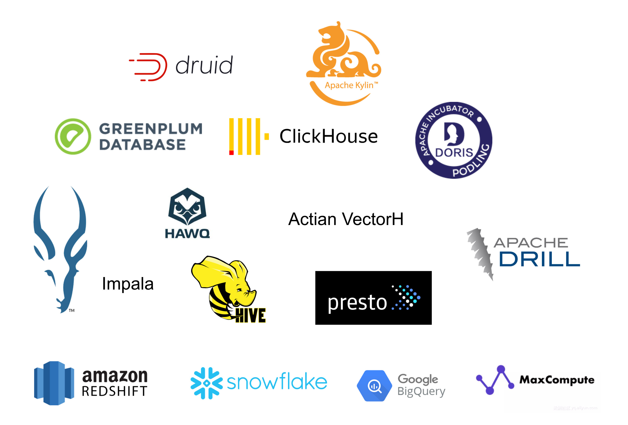 存储计算一体,自己实现存储层,如Greenplum、Clickhouse、Doris(原Baidu Palo)等