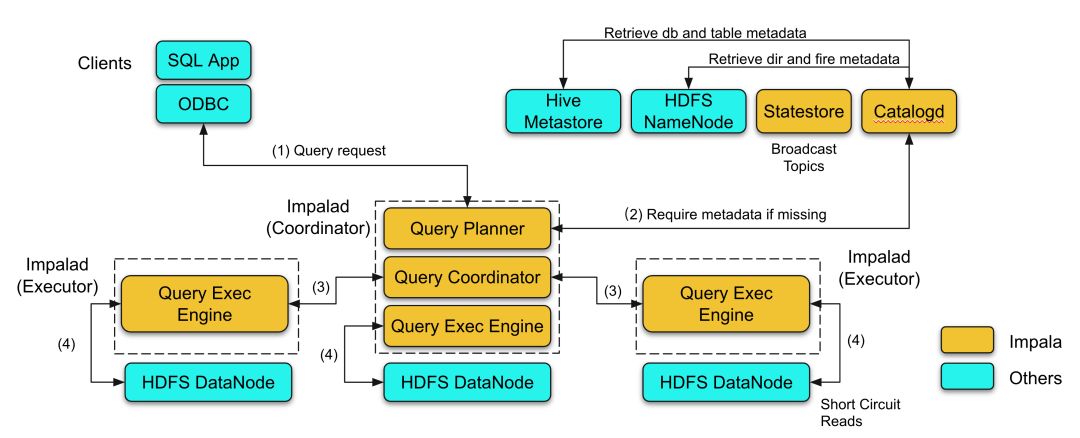 Impalad中的Coordinator也会缓存元数据,负责接收SQL查询请求并生成执行计划,并将执行计划的分片(PlanFragment)调度到各Executor去执行,最终汇总结果返回给客户端。