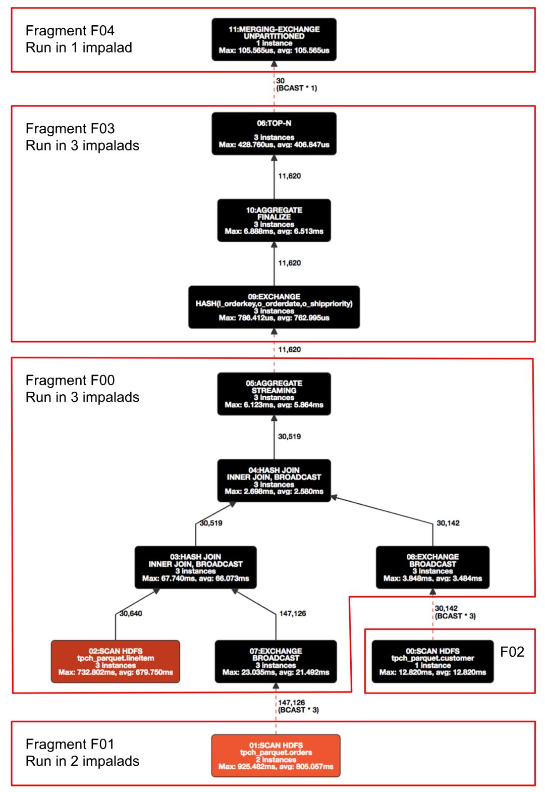 如图是TPC-H Benchmark中Query3的执行计划,根据是否需要broadcast、shuffle等被切分成几个PlanFragment。每个Executor执行的就是Plan Fragment的实例。