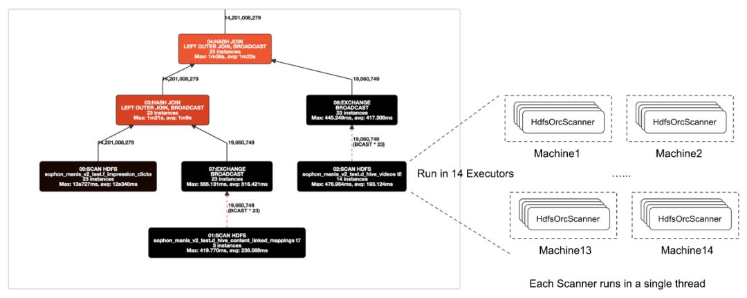 这部分工作的核心是实现一个HdfsOrcScanner,因为Query执行的大部分逻辑如语法分析、语义分析、调度等基本可以复用已有的实现,唯独最终解析ORC文件这块需要专门的实现。前面我们介绍过了Impala的执行计划树,树的叶子节点都是ScanNode。每个ScanNode的实例负责读取若干个数据分片(split),每个split由一个Scanner线程去处理。如下图所示,编号02的HdfsScanNode有14个实例,分别运行在14个Executor上。每个实例会启动若干个Scanner线程来读取split。