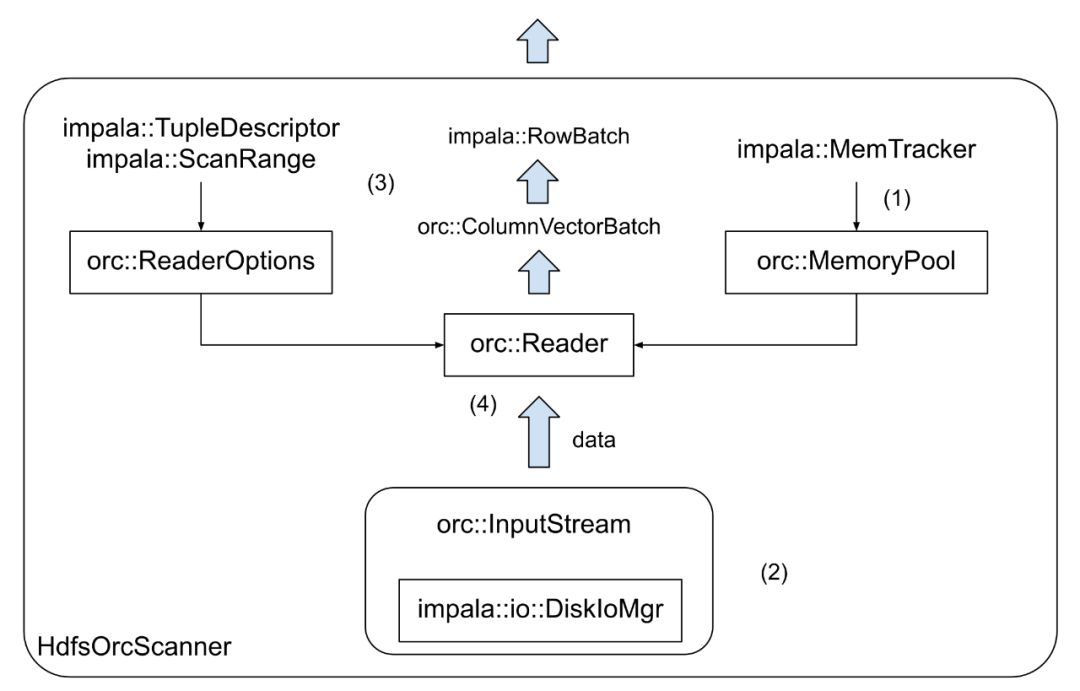 Impala支持的所有HDFS文件格式(如Parquet、Avro、SequenceFile、RCFile、Text等)都有一个对应的scanner实现,为了支持ORC,我们同样要实现一个HdfsOrcScanner。