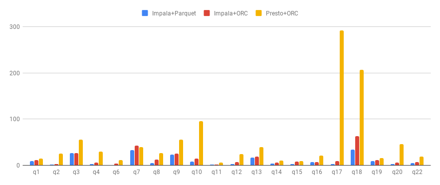 上图对比了Impala on Parquet、Impala on ORC、Presto on ORC在TPC-H基准测试中的20个查询的耗时(单位:秒)。可以看到Impala on ORC的性能虽然比不上Impala on Parquet,但相比Presto on ORC还是有很大的优势。Impala的ORC scanner还有很多优化可做,比如支持Aggregation Pushdown、结合ORC文件的统计信息来减少无用IO、使用DiskIoMgr的异步IO接口等,理论上应该能达到与Parquet scanner相近的性能。关于后续的工作,欢迎关注IMPALA-6505、IMPALA-6636、IMPALA-8046等相关JIRA。