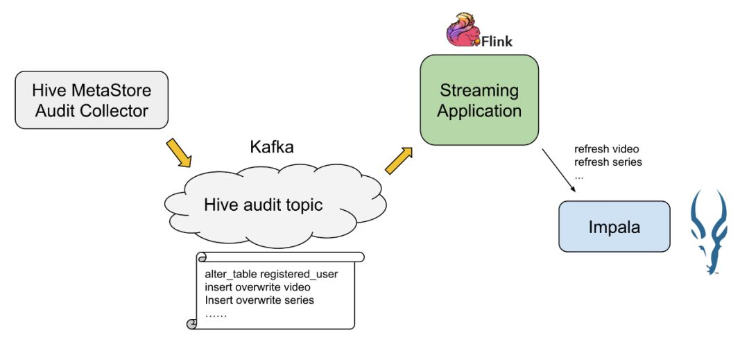 为了将Impala无缝引入我们已有的Hadoop数仓,我们需要将元数据刷新自动化。如图所示,我们搭建了一个pipeline,当Hive中的表有更新时,Hive MetaStore会记下一条audit 日志。Audit collector将其发送到Kafka,然后被一个Flink job消费,触发Impala刷新缓存。