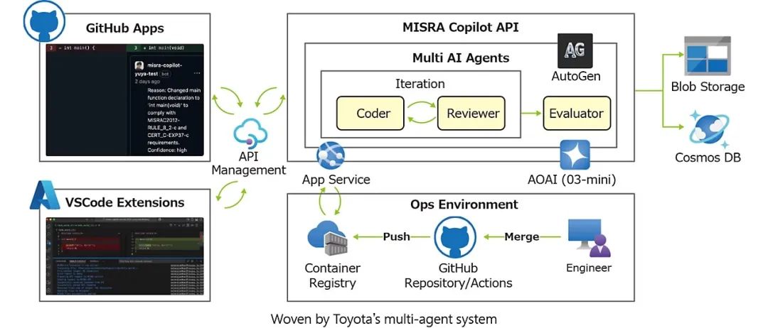 下图展示了该系统的配置:采用新型 o3-mini 的生成式 AI 模型,具备更强的编码能力。同时包含 Azure OpenAI 服务(国际版)、Azure App Service、Azure Cosmos DB、GitHub Enterprise 和 AutoGen 等流行产品和服务。