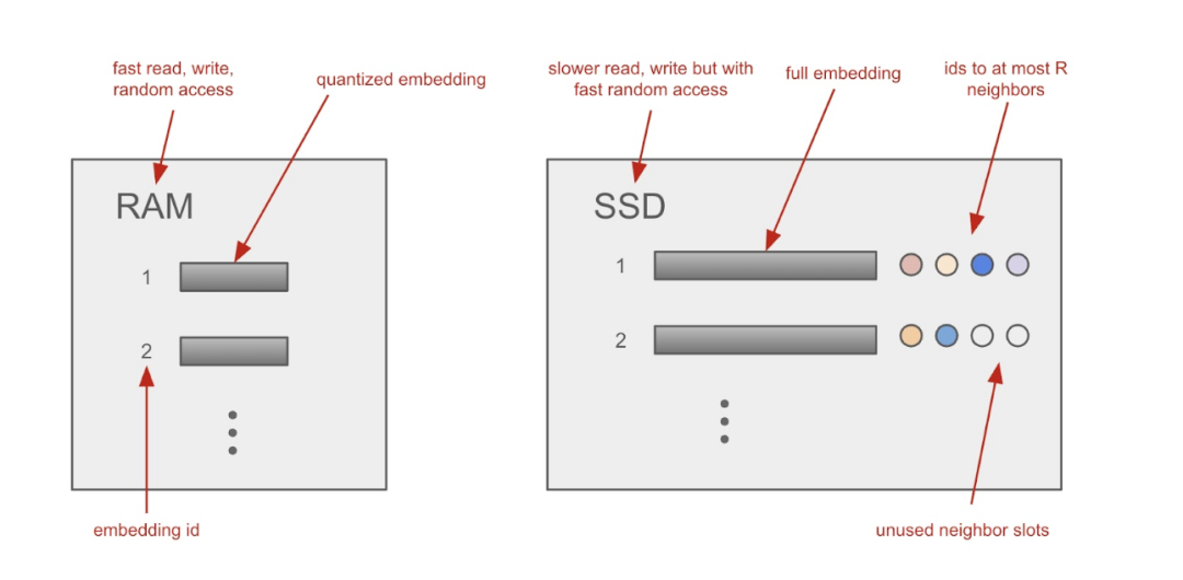 图示:DiskANN 如何在 RAM 与 SSD 之间存储向量索引
