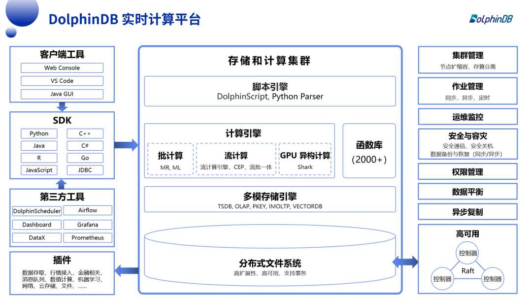 在存储层面,DolphinDB 具备多模态存储的能力,支持 TSDB、OLAP、PKEY、IMOLTP、VECTORDB 五大引擎,可以存储、管理不同类型的数据。在计算层面,DolphinDB 集成了批计算、流计算以及 GPU 异构计算。为了响应不断变化的业务逻辑,DolphinDB 通过内置函数库、内置引擎、插件和模块等形式为用户提供了许多业务中间件,用户也可以自主开发插件和模块来扩展功能。同时,作为一款企业级基础软件,DolphinDB 也具备了良好的生态兼容性和完善的运维管理体系。