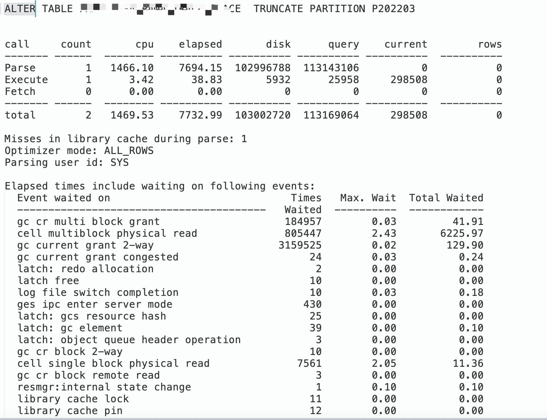 客户truncate一个分区表,表没有数据,但是占用空间达600GB,truncate花了将近2个小时。为了查明原因,做了一个10046事件来记录整个过程。