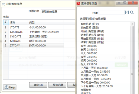 从“核心对象”栏拖放一个“获取系统信息”组件,双击该组件进行配置信息,在字段标签下,可以选择不同时间。