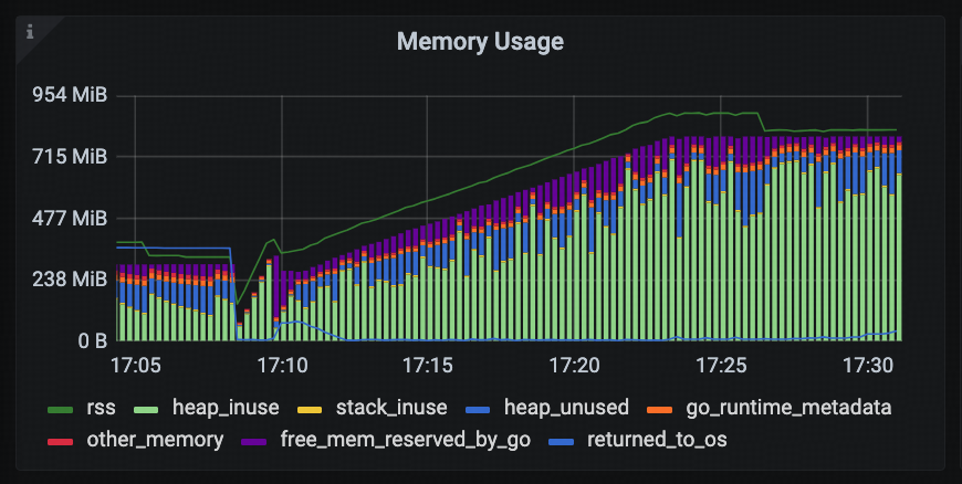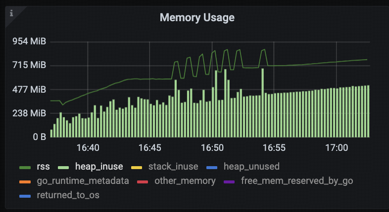 同时,从 tidb-runtime -> Memory Usage 监控面板来看,tidb-server 进程的 RSS 内存使用量在 16:46 ~ 16:55 期间从 580MB 增加至 712MB,并在之后持续上升。按照前述分析,在这个内存区间内,GOMEMLIMIT 应该始终保持在上界,但监控数据显示 GOMEMLIMIT 仍然维持在下界,不符合预期。因此,我们怀疑 tidb_server_memory_limit_gc_trigger的自适应调整机制未生效。
