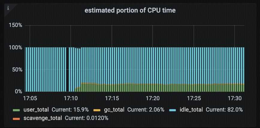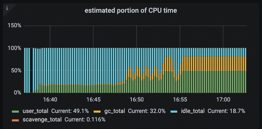 由于 CPU 使用率明显异常,首先查看 tidb-runtime -> estimated portion of CPU time 监控面板,分析具体是哪些任务导致了高 CPU 负载。从监控数据来看,gc_total 的 CPU 占比在 16:48 之后显著增加,从 1.8% 迅速上升,并最终稳定在 32%。此外,gc_total 的 CPU 占比与 CPU 使用率的高负载呈现明显的正相关关系。