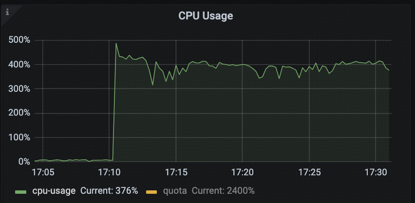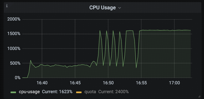 从 tidb-runtime -> CPU Usage 监控面板可以看到,从 16:48 开始,CPU 使用率出现大幅波动,并在 16:55 之后持续保持在满载状态。