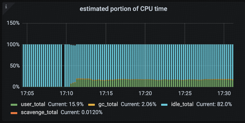 对于 CPU 使用异常升高或波动剧烈的问题,可以借助 estimated portion of CPU time 分析面板,区分用户代码和 Runtime 层的消耗比例,识别是否是 GC、Scavenge 等系统层消耗占比过高,从而进一步定位 CPU 开销的具体来源。